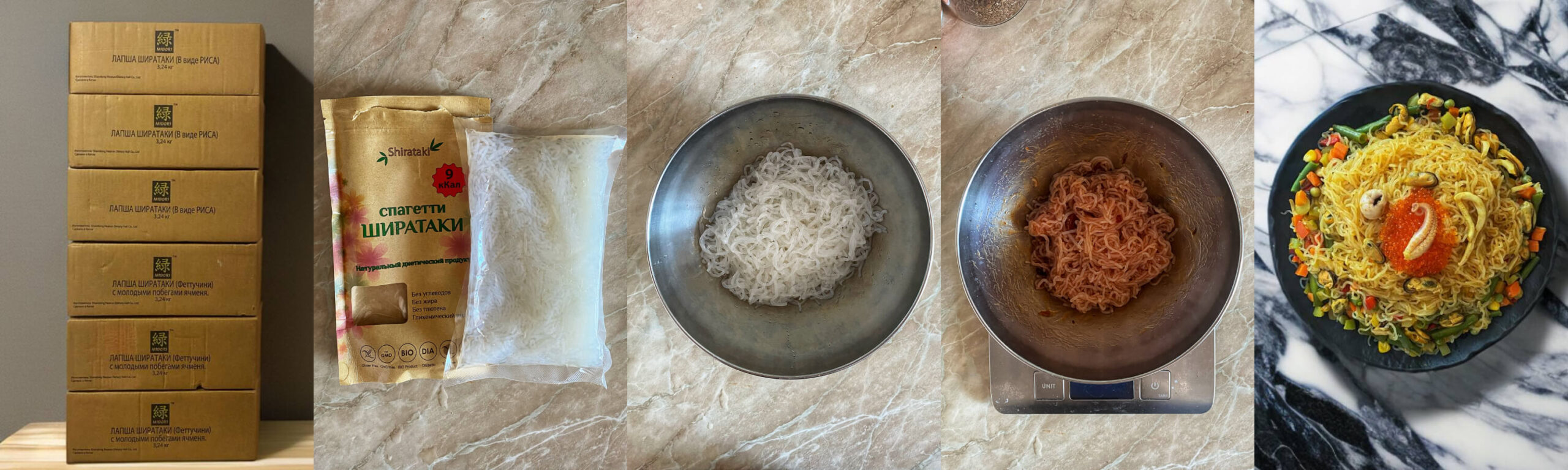 - Рис Shirataki: визуально похож рис. Не очень удобно в готовке: мелкие зерна прилипают и рассыпаются. Интересно в потреблении: ощущается несколько иначе чем лапша. Пример блюда.