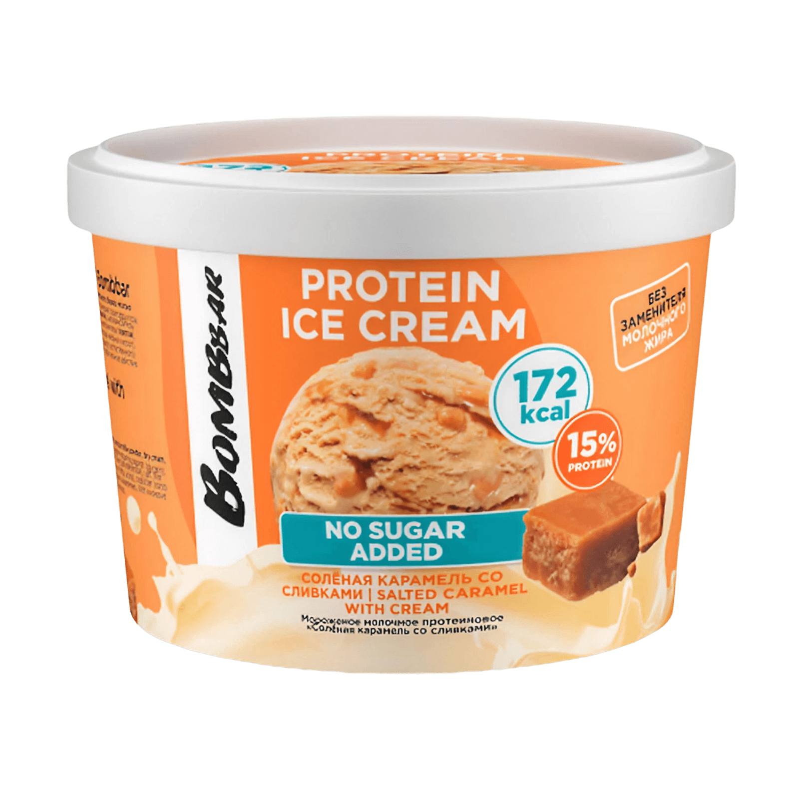 Протеиновое мороженое Bombbar «Солёная карамель со сливками» богато полноценными белками, представленными концентратом сывороточного белка и натуральными молочными компонентами. Жиры поступают из цельного молока, сухих сливок и кокосового масла, что обеспечивает продукту кремовую текстуру. Углеводный состав включает комплексные соединения без добавления сахара. Пищевые волокна представлены инулином и олигофруктозой из цикория, полидекстрозой и изомальтоолигосахаридами. Витаминный состав включает характерные для молочных продуктов витамины A, D, группы B (особенно B2, B12), а также витамин С, добавленный в качестве антиокислителя. Минеральный комплекс представлен кальцием, фосфором, калием, магнием и натрием. Особенность продукта — наличие соли, которая подчеркивает вкус карамели и создает неповторимый вкусовой профиль.
