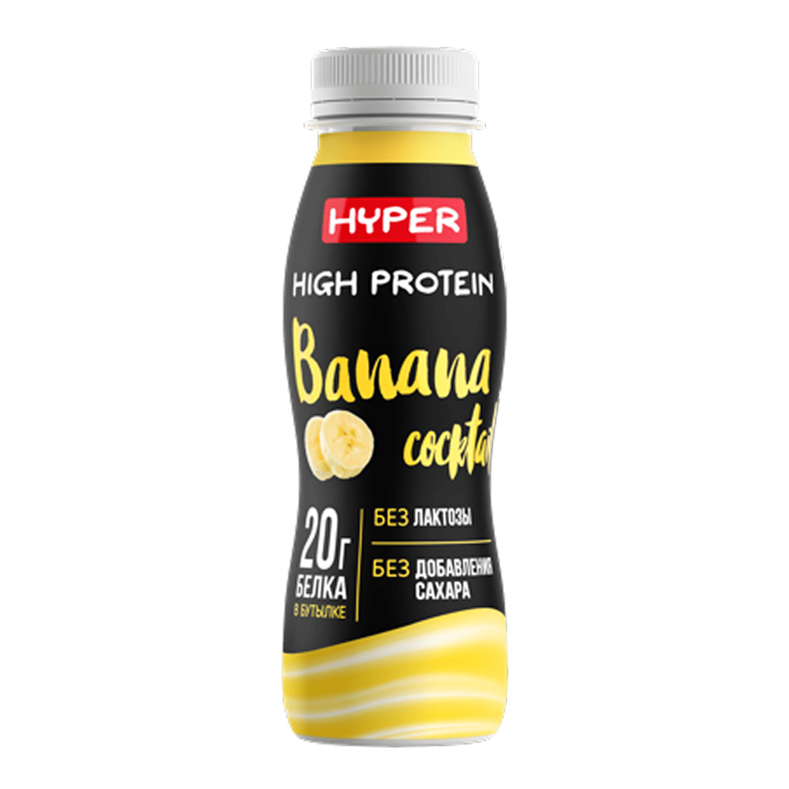 Коктейль Ehrmann Hyper High Protein Банан имеет следующий состав: молоко обезжиренное, белок молочный, загуститель каррагинан, банан, сливки, ароматизатор натуральный, ферментный препарат микробного происхождения лактаза, какао-порошок, мальтодекстрин, регулятор кислотности гидроксид калия, подсластители (ацесульфам, сукралоза), краситель каротины, эмульгатор Е900. Продукт может содержать следы глютена, яиц, сои, арахиса и орехов.