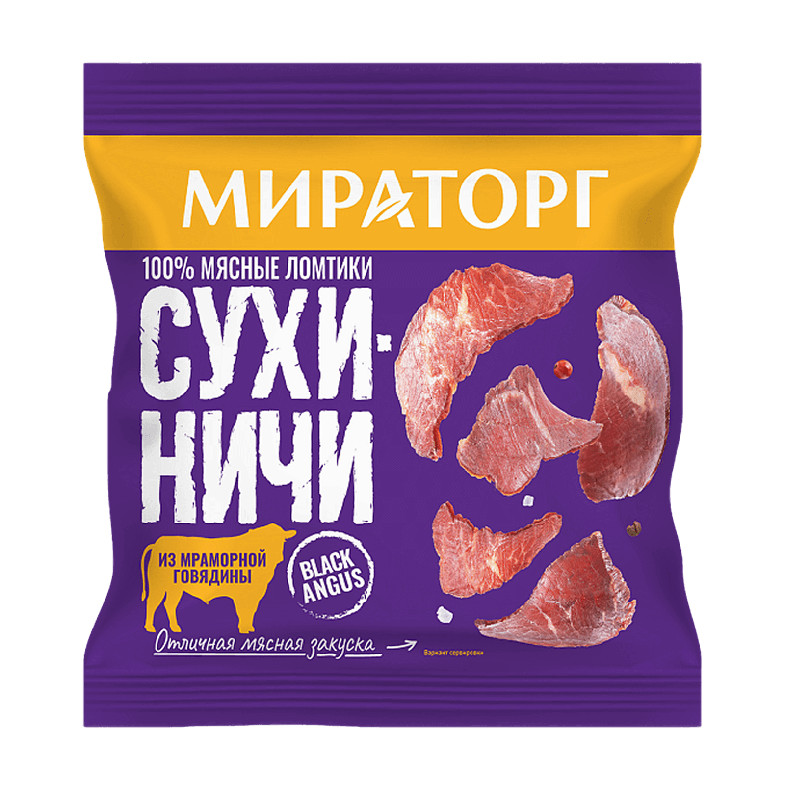Линейка мясных снеков «Сухиничи« была запущена компанией «Мираторг« в 2018 году как часть стратегии по расширению ассортимента мясных деликатесов. Технология щадящей сушки разработана совместно с немецкими специалистами для сохранения питательных свойств сырья. Использование премиальной мраморной говядины Black Angus стало отличительной чертой продукта. Производство локализовано на собственных фермерских хозяйствах компании в Белгородской области.