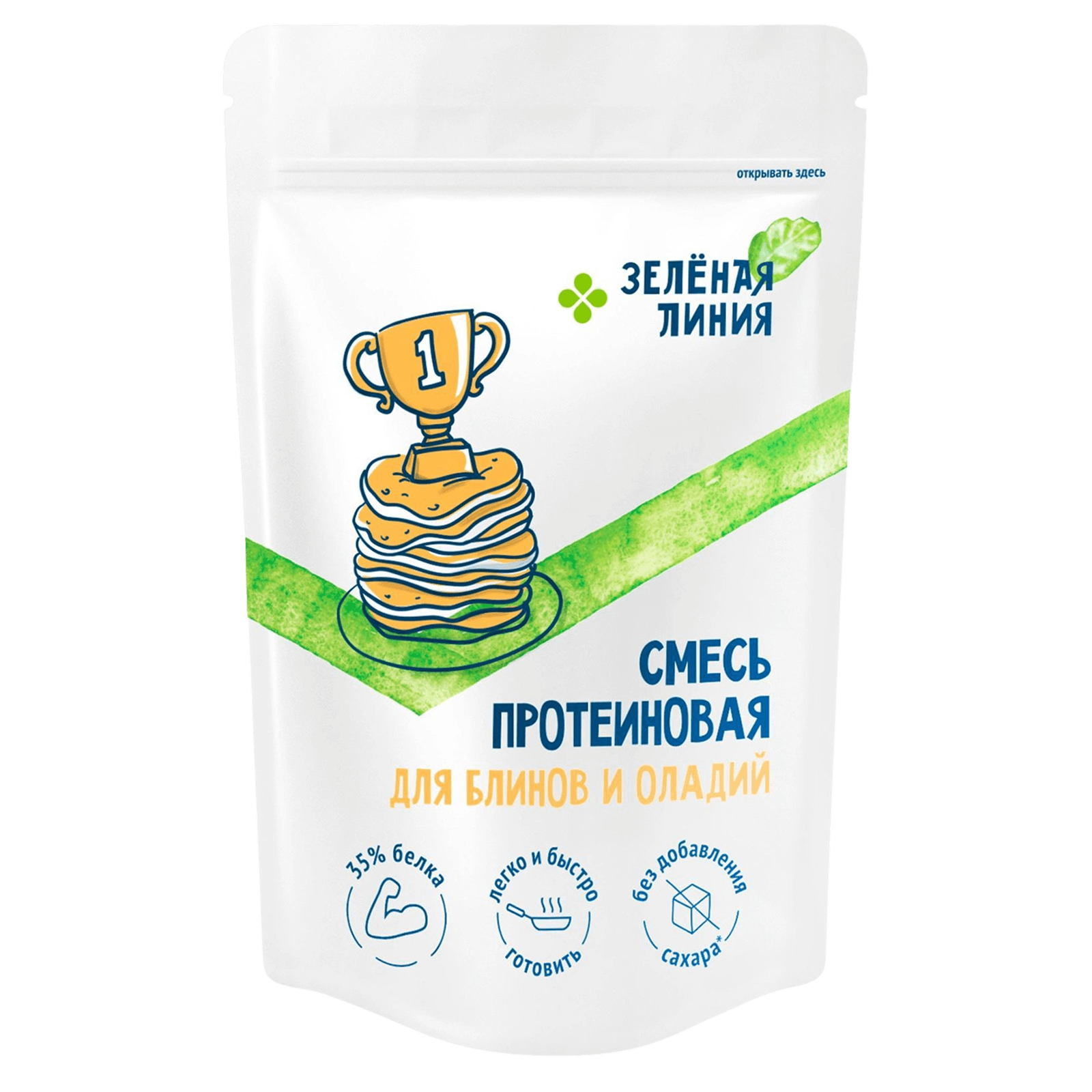 Протеиновая смесь для выпечки блинов и оладий Зелёная Линия продаётся в упаковке весом 300 грамм. Цена за эту упаковку составляет 300 рублей. Таким образом, стоимость 100 грамм продукта равна 100 рублям. Учитывая высокое содержание белка (35 г на 100 г смеси), продукт позиционируется как специализированный для обогащения рациона протеином.