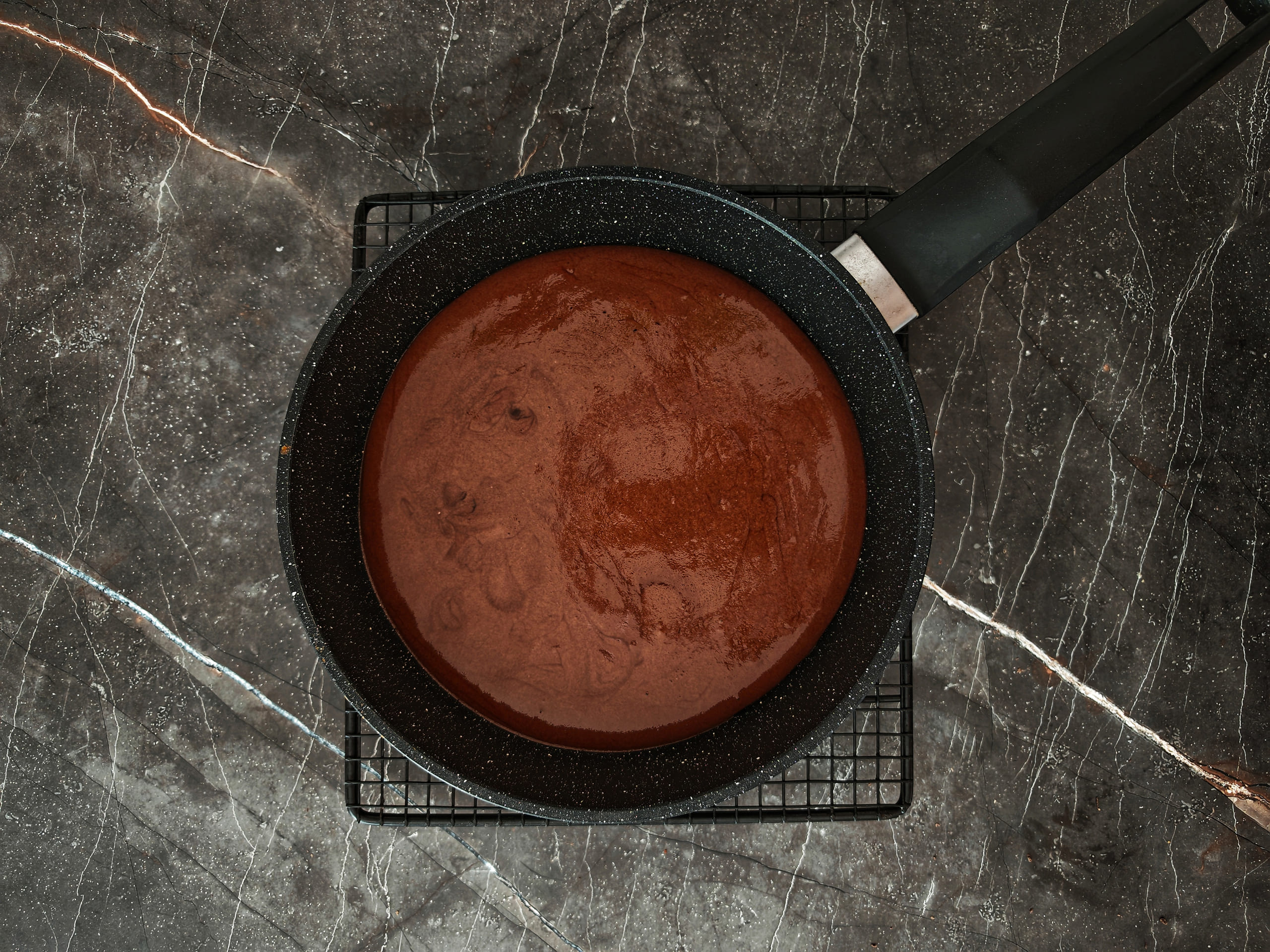 Равномерно распределите смесь на сковороде. Толщина смеси будет определять толщину коржа: можно сделать более объёмный корж для основы торта, а оставшиеся коржи сделать тонкими, как блинчики. Всего из количества смеси в рецепте можно сделать 3-5 коржей диаметра средней сковороды.
