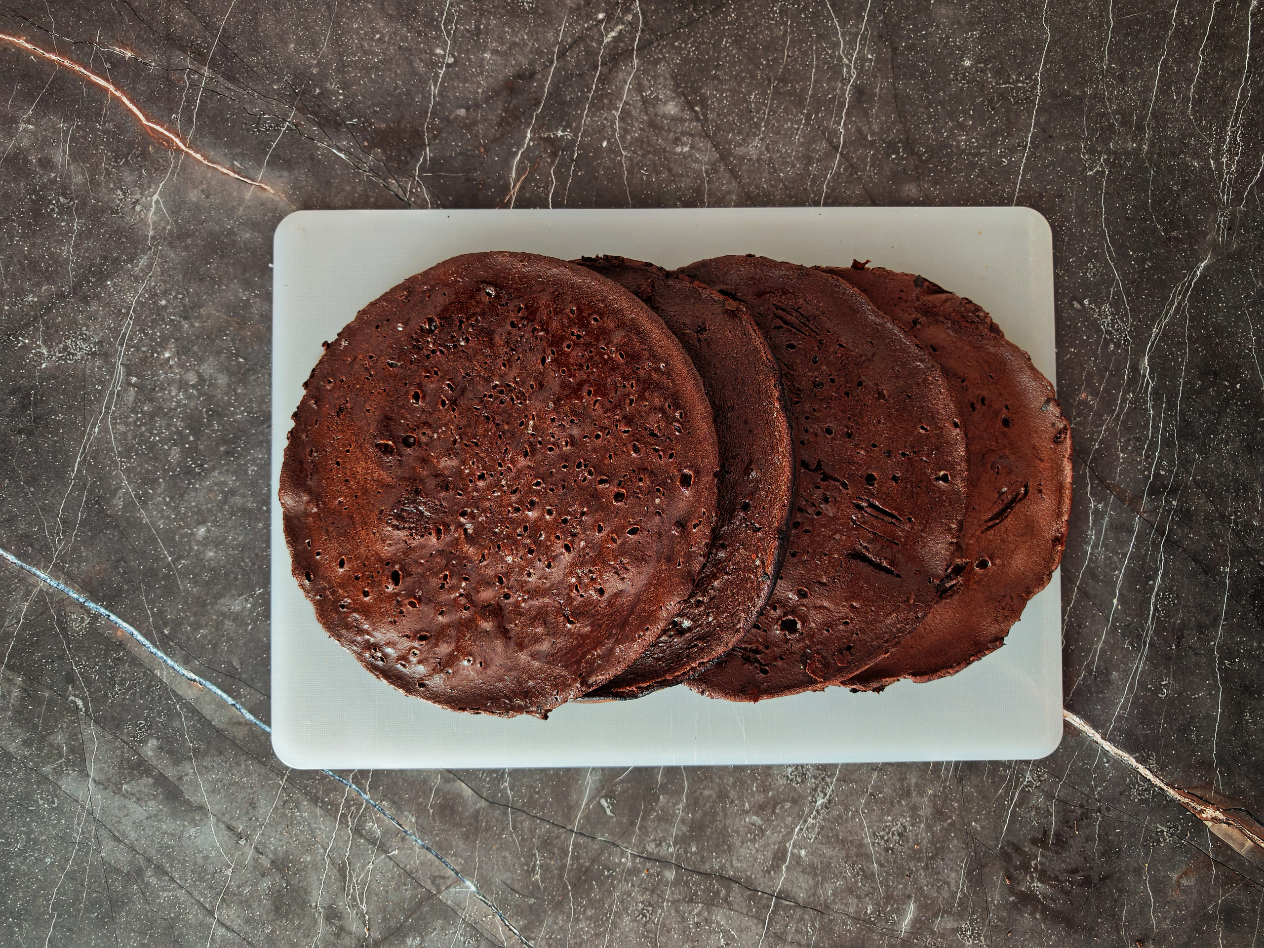 Повторите процесс жарки для оставшейся смеси так, чтобы в итоге получилось 3-5 коржей. Разместите готовые коржи на разделочной доске.