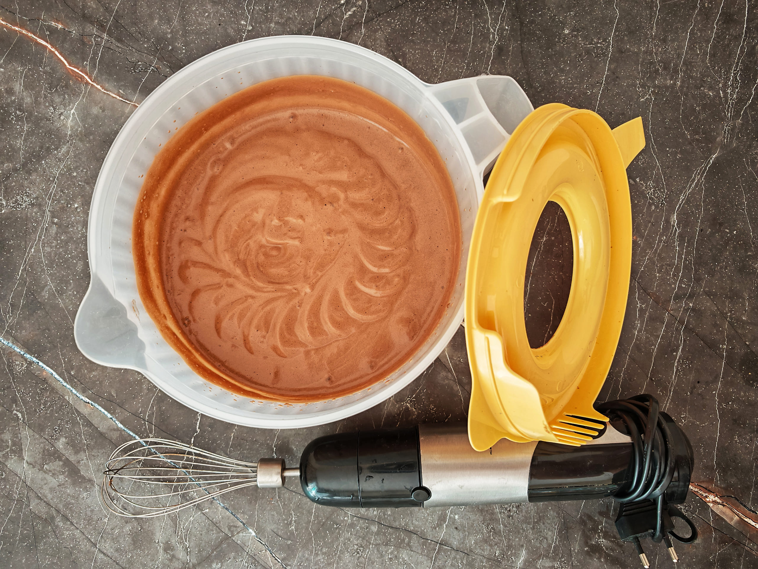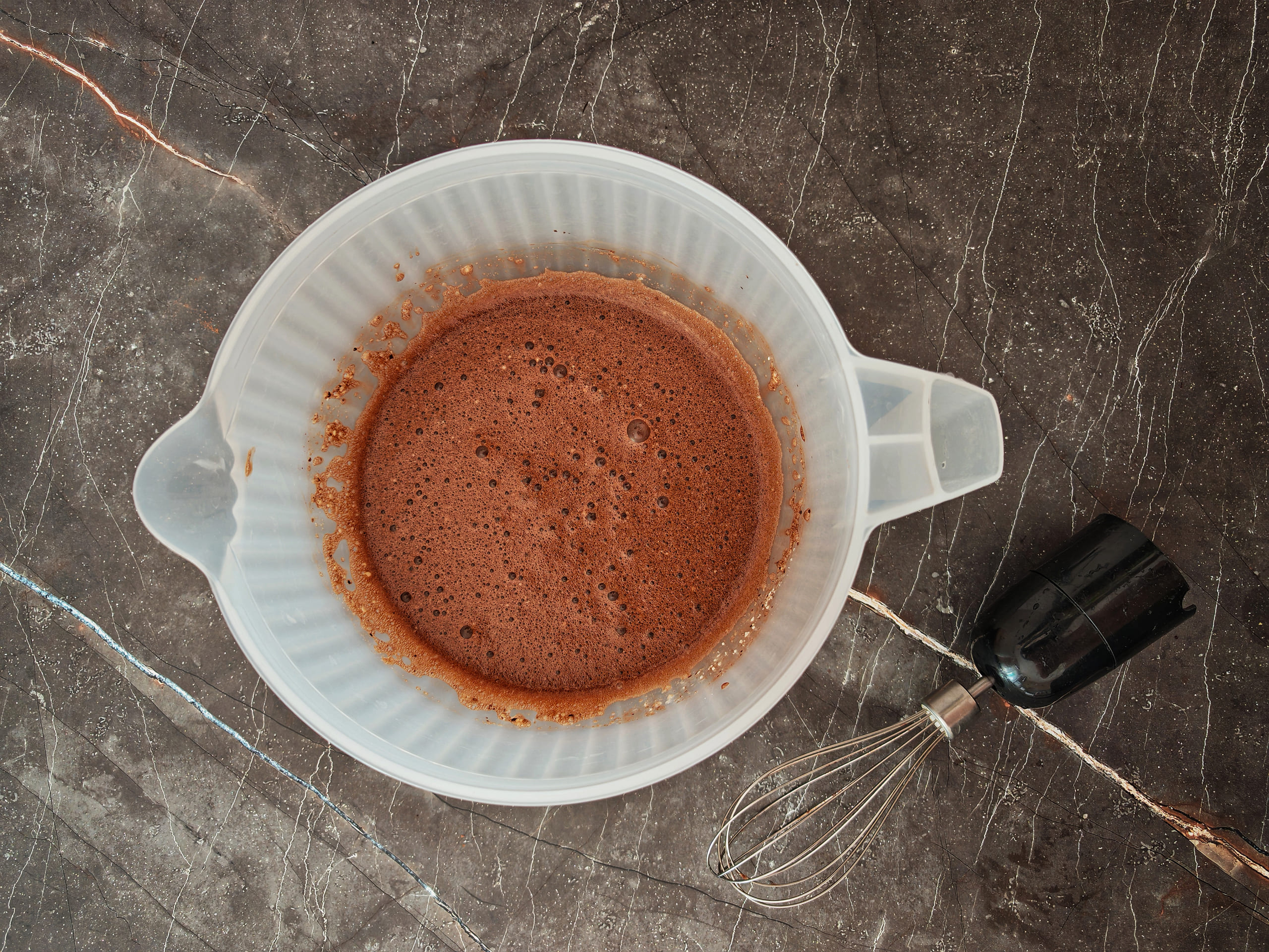 Используя венчик, перемешайте ингредиенты и доведите смесь до однородной текстуры и цвета. По плотности можно ориентироваться на консистенцию смеси для приготовления блинов (если недостаточно жидко, можно дополнительно добавить воды).