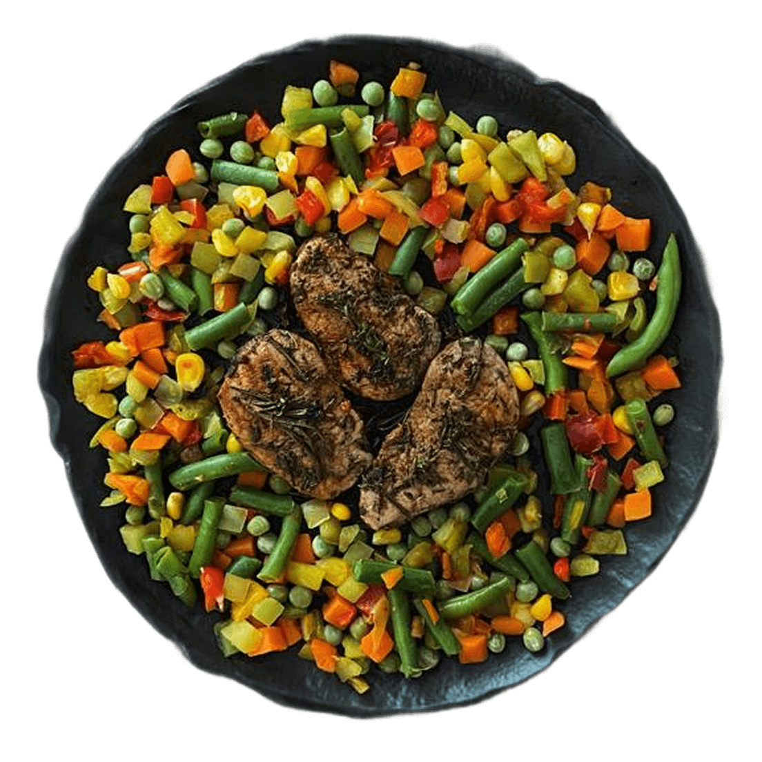 Вариация блюда «Овощи и белок»: гарниром выбрана овощная смесь, источником белка — медальоны из свинины. Смесь «По-деревенски» привнесла в блюдо яркие цвета и небольшие фрагменты овощей.