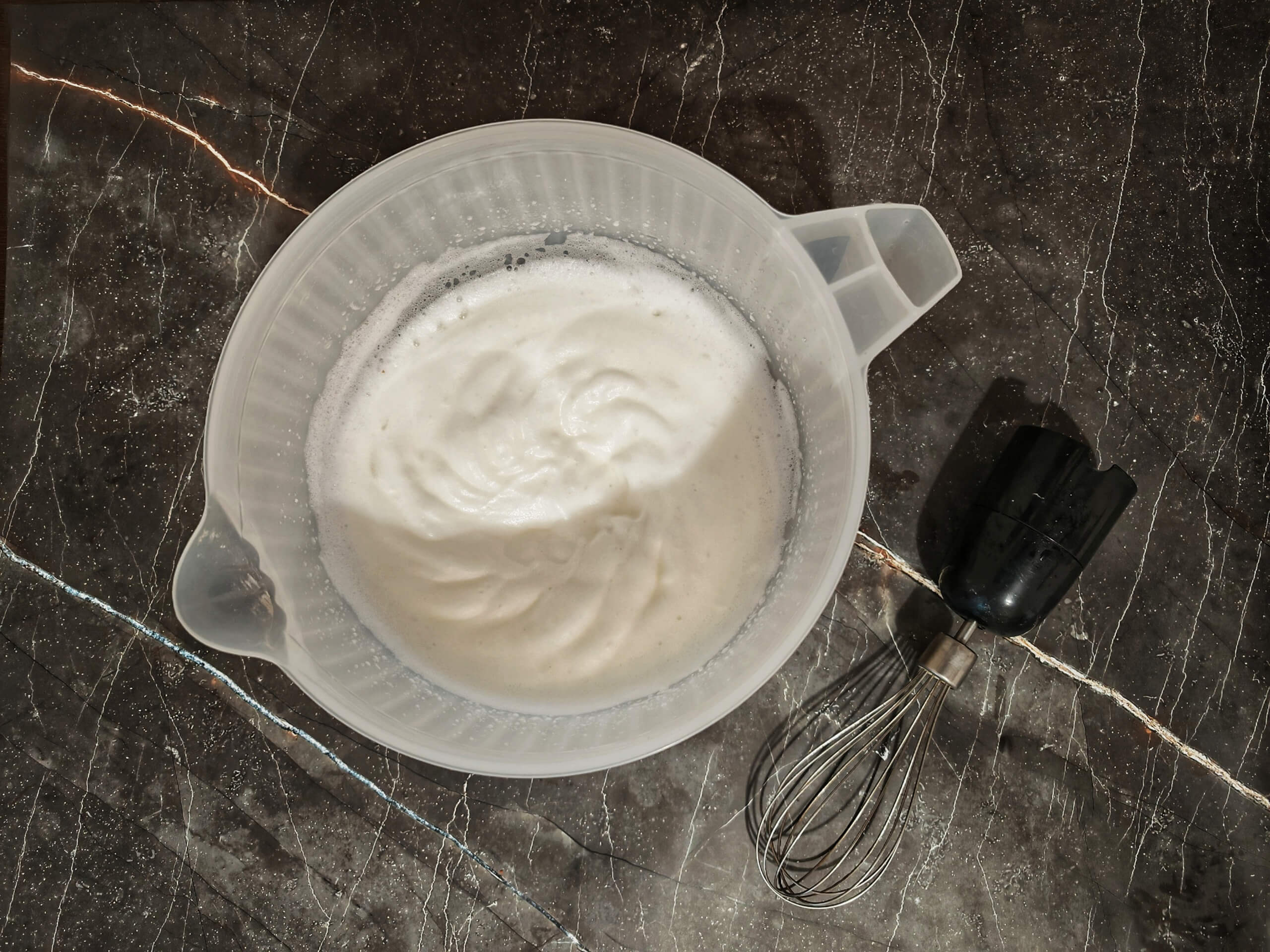 Взбейте жидкий белок до средних пиков (2 мин)