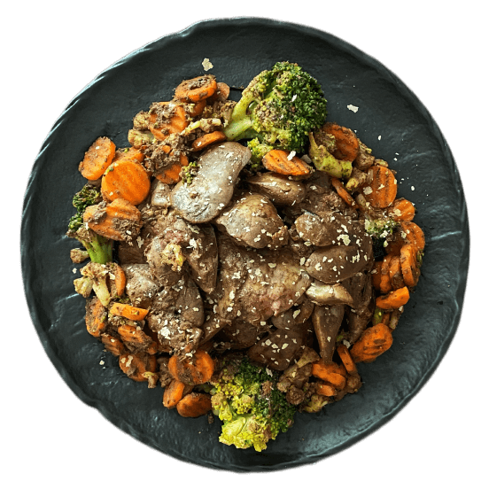 Вариация блюда «Овощи и белок»: гарниром выбрана овощная смесь, источником белка — печень куриная охлажденная.