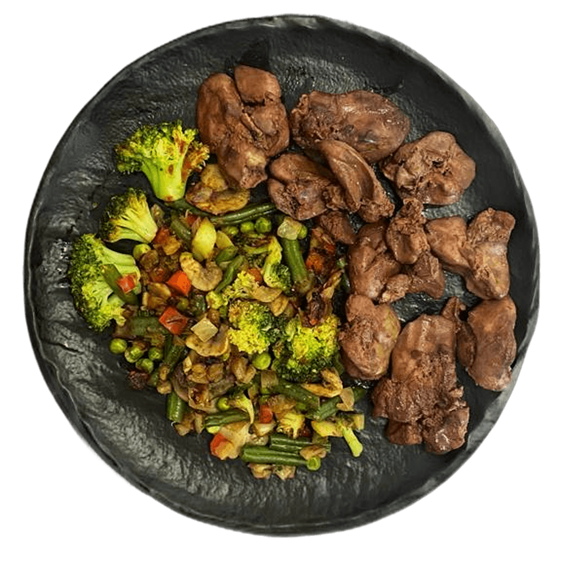 Вариация блюда «Овощи и белок»: гарниром выбрана овощная смесь, источником белка — печень птицы. В этой вариации понравилось сочетание соусов и раскладка овощей на тарелке. Еще понравилась куриная печень: цвет на фотографиях, вкус, доступная цена. По калорийности блюдо сбалансированное: много белка, достаточно много жира.