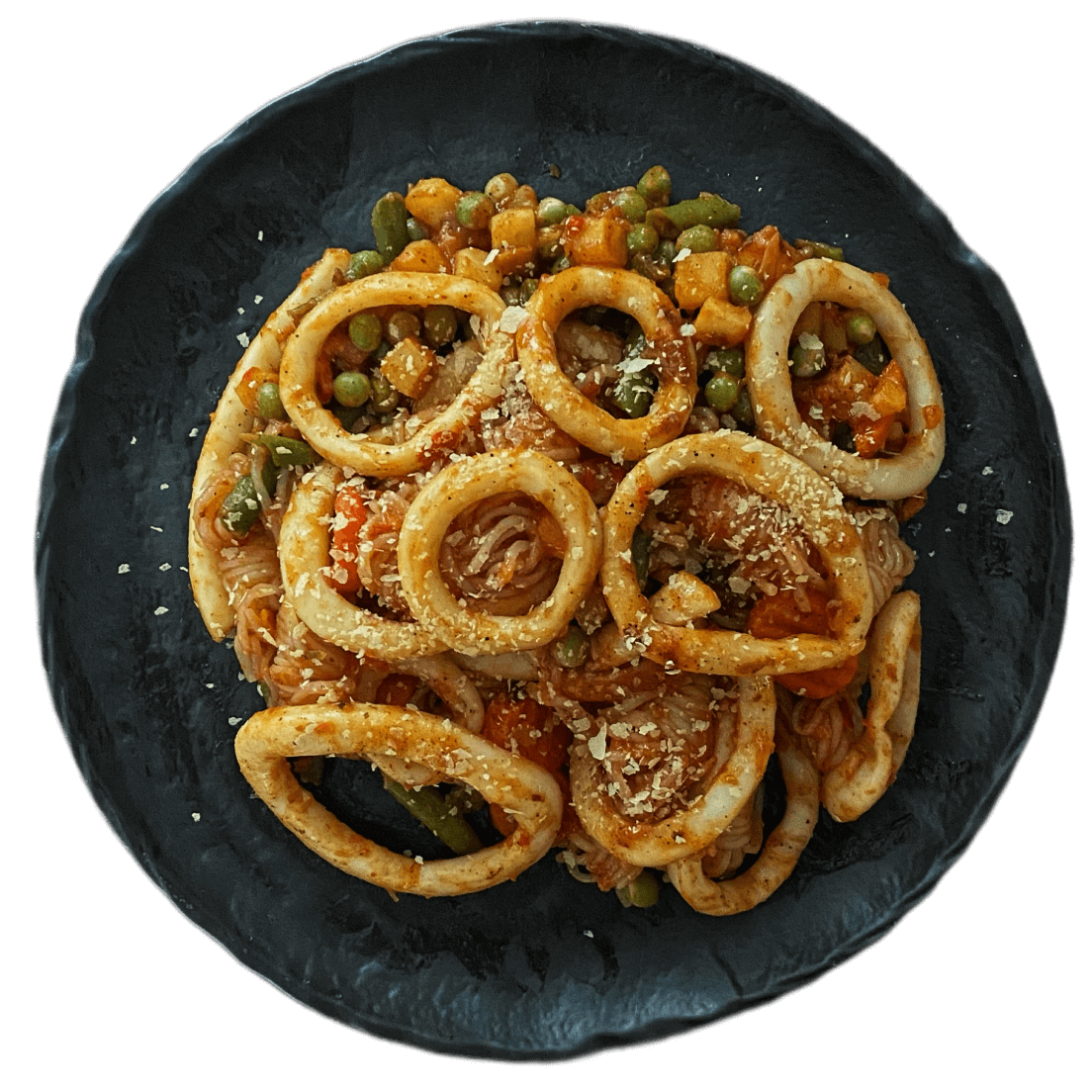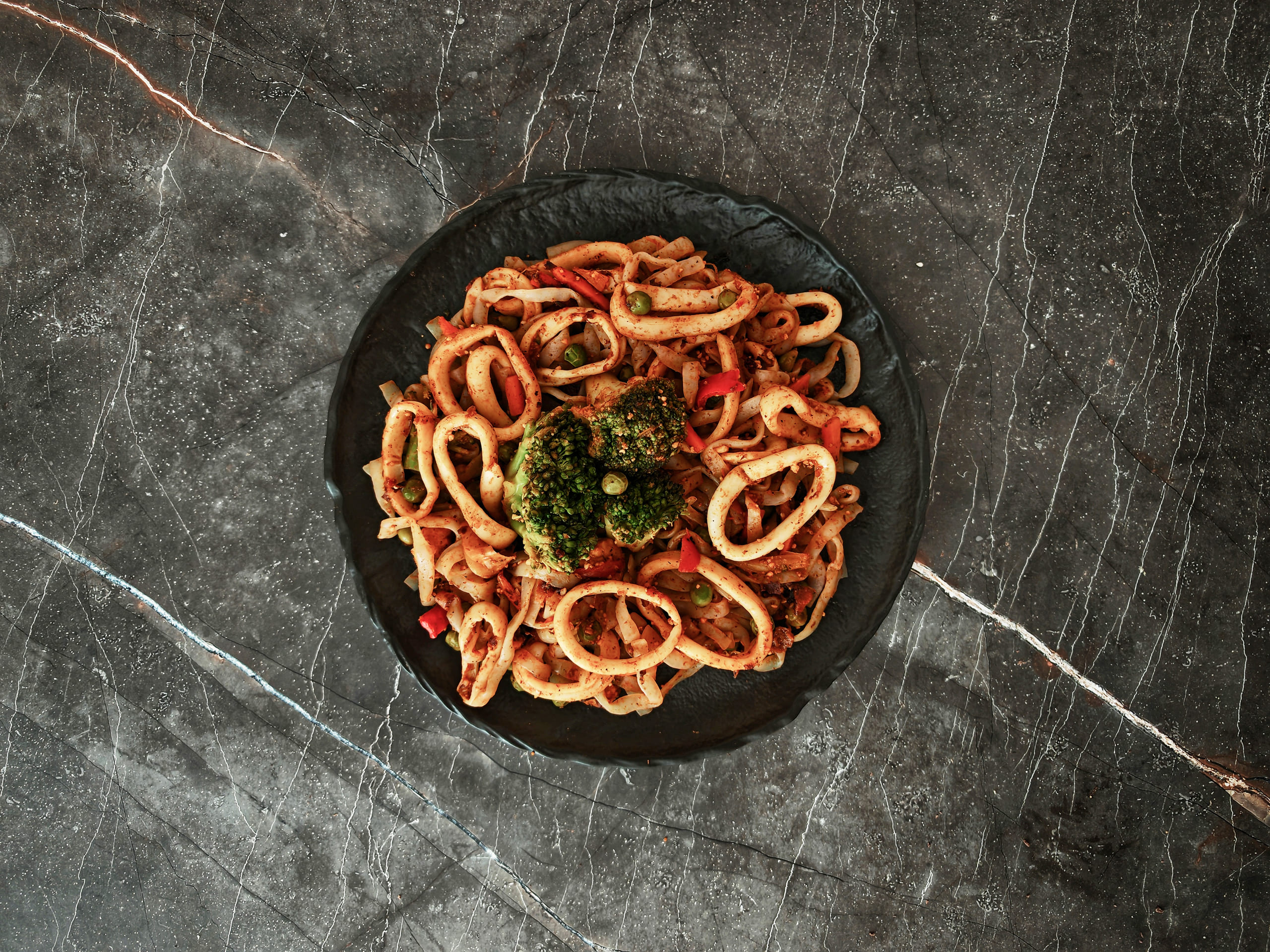 Wok из фетучини ширатаки с овощами и кальмарами
