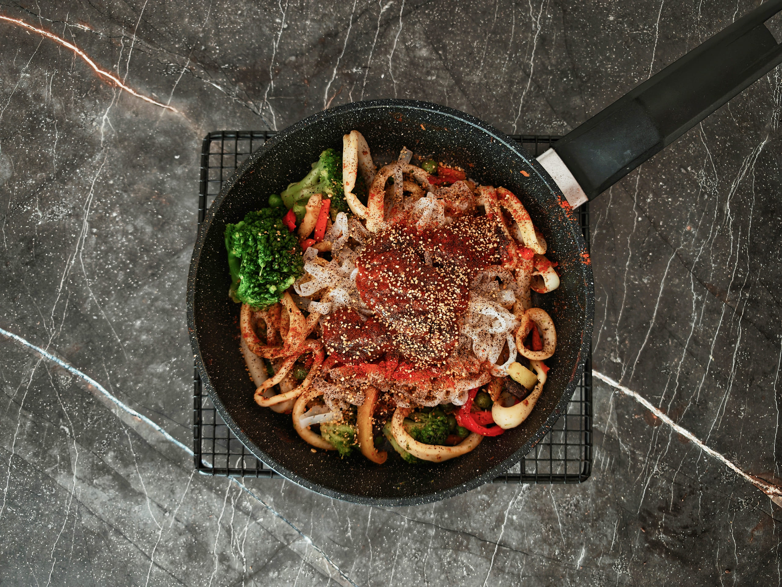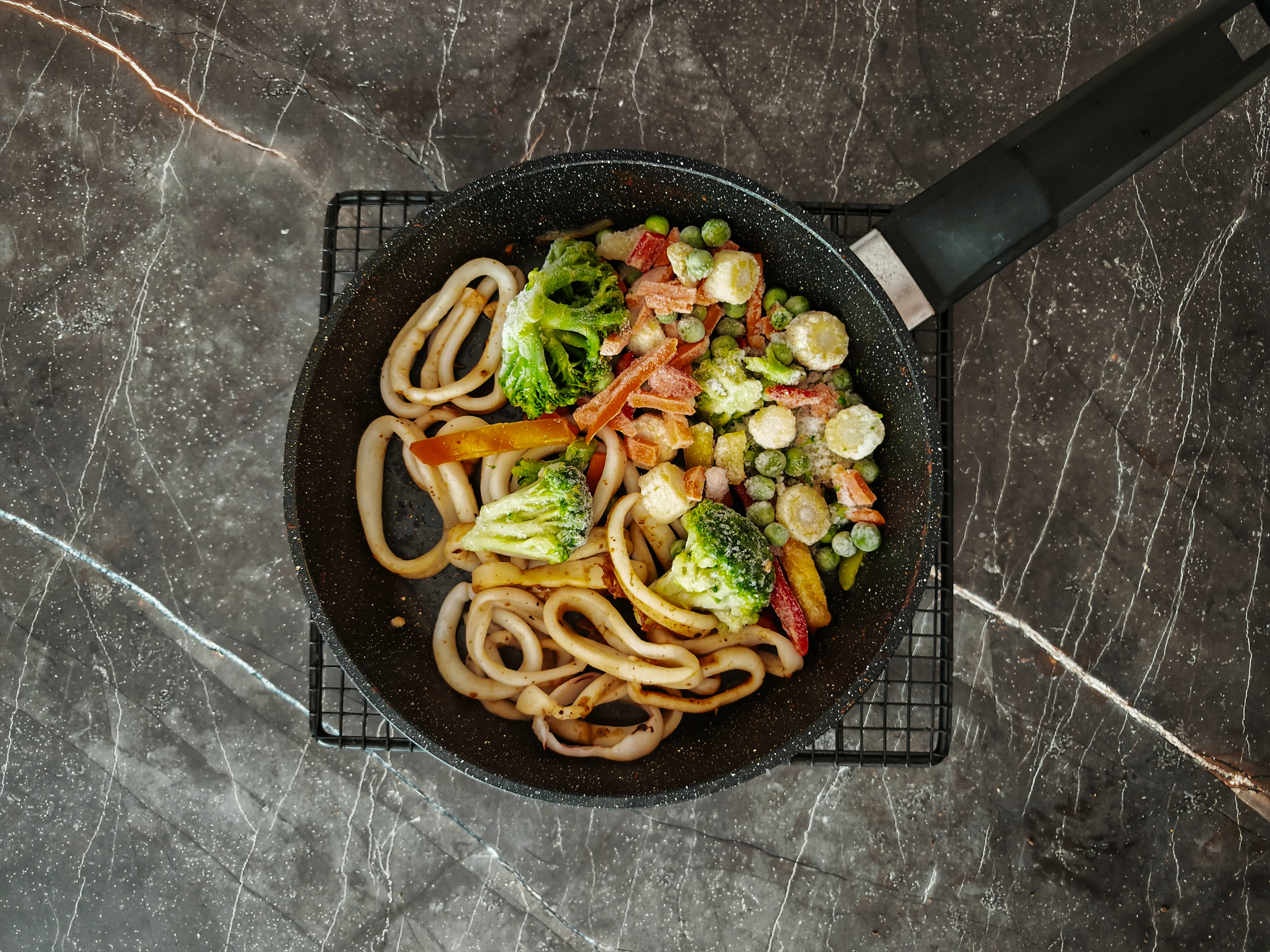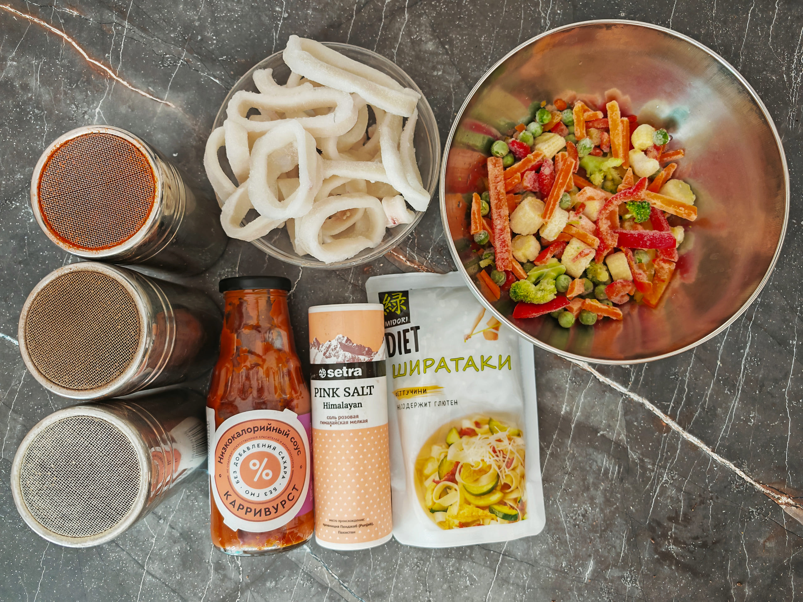 Кальмар готовил 2 + 2 + 2 минуты, после каждой двойки помешивая. На 3-й минуте слил воду. На 5-й минуте добавил овощную смесь и на 7-й минуте — ширатаки. Итоговая готовность 8 минут, если мариновать ширатаки во время жарки морепродукта.