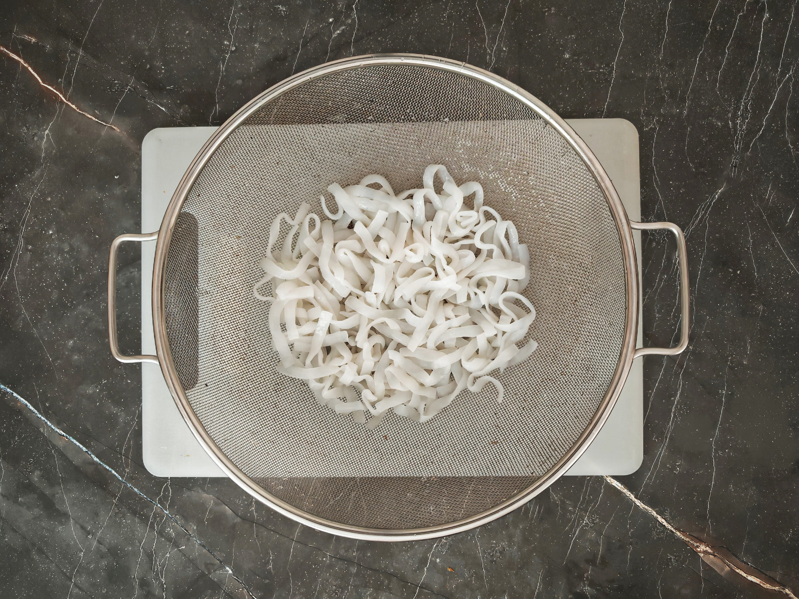 Разместите дуршлаг в раковине или над емкостью, в которую будет собираться жидкость. Извлеките ширатаки из упаковки в дуршлаг. Промойте проточной водой. Желательно дополнительно осушить ширатаки: перемешать лапшу в дуршлаге и дать сойти воде, чтобы излишняя влага не размыла вкус блюда при жарке.