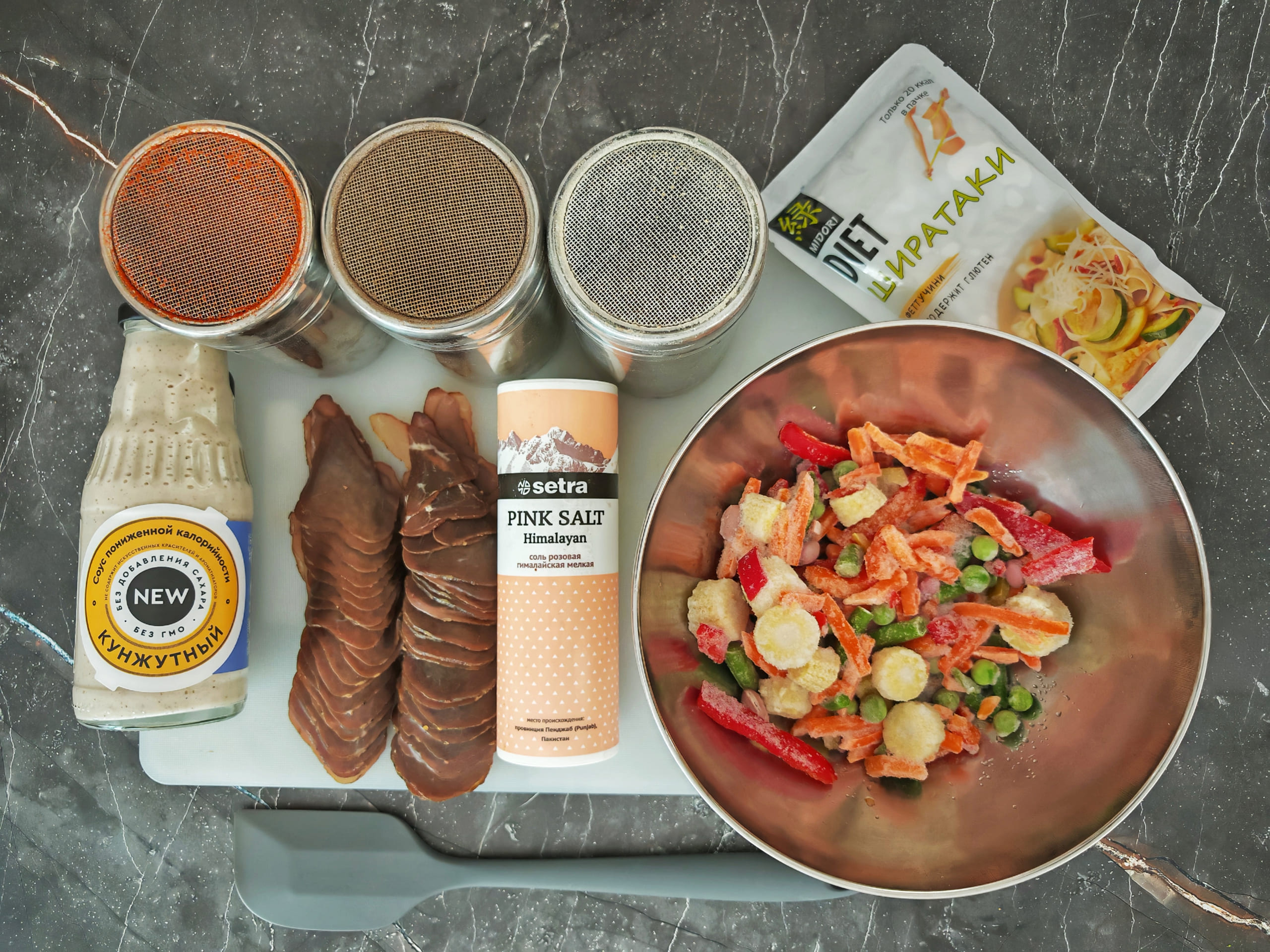 Для приготовления потребуется ширатаки, мясная нарезка, овощная смесь, соус и специи. При желании можно дополнить декором: овощами, зеленью и др. Для удобства можно использовать кулинарные приборы из списка ниже.