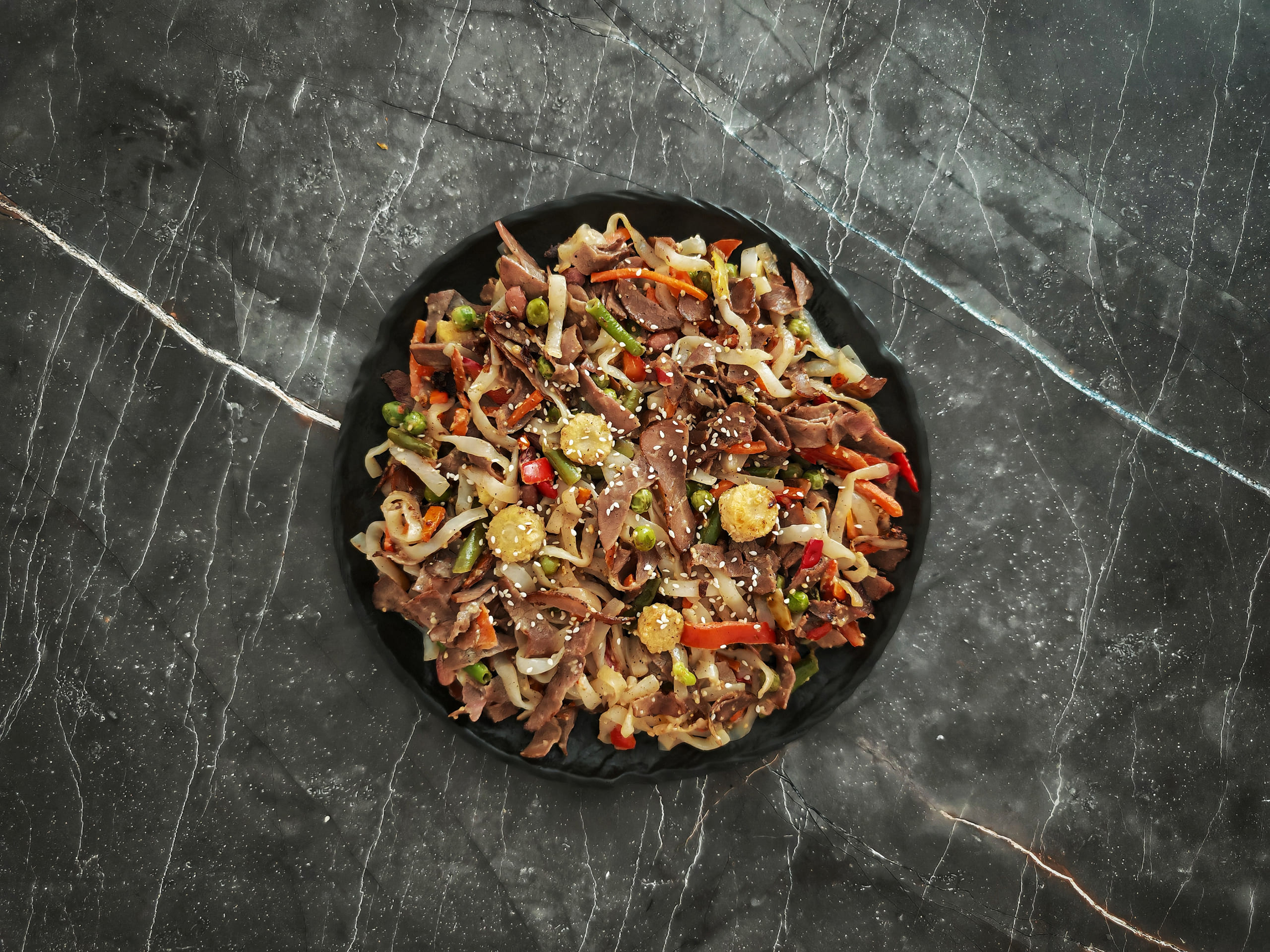 Wok из фетучини ширатаки с овощами и мясной нарезкой